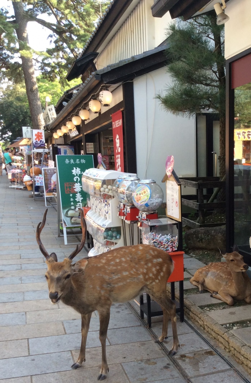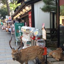 店頭で、鹿が休んでいるのは、おもしろい光景でした。