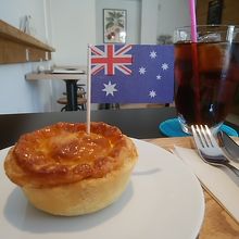 パイは温かいです。オーストラリアの国旗がかわいい。直径はおそらく6~7㎝くらい。おやつにちょうどいいサイズ。