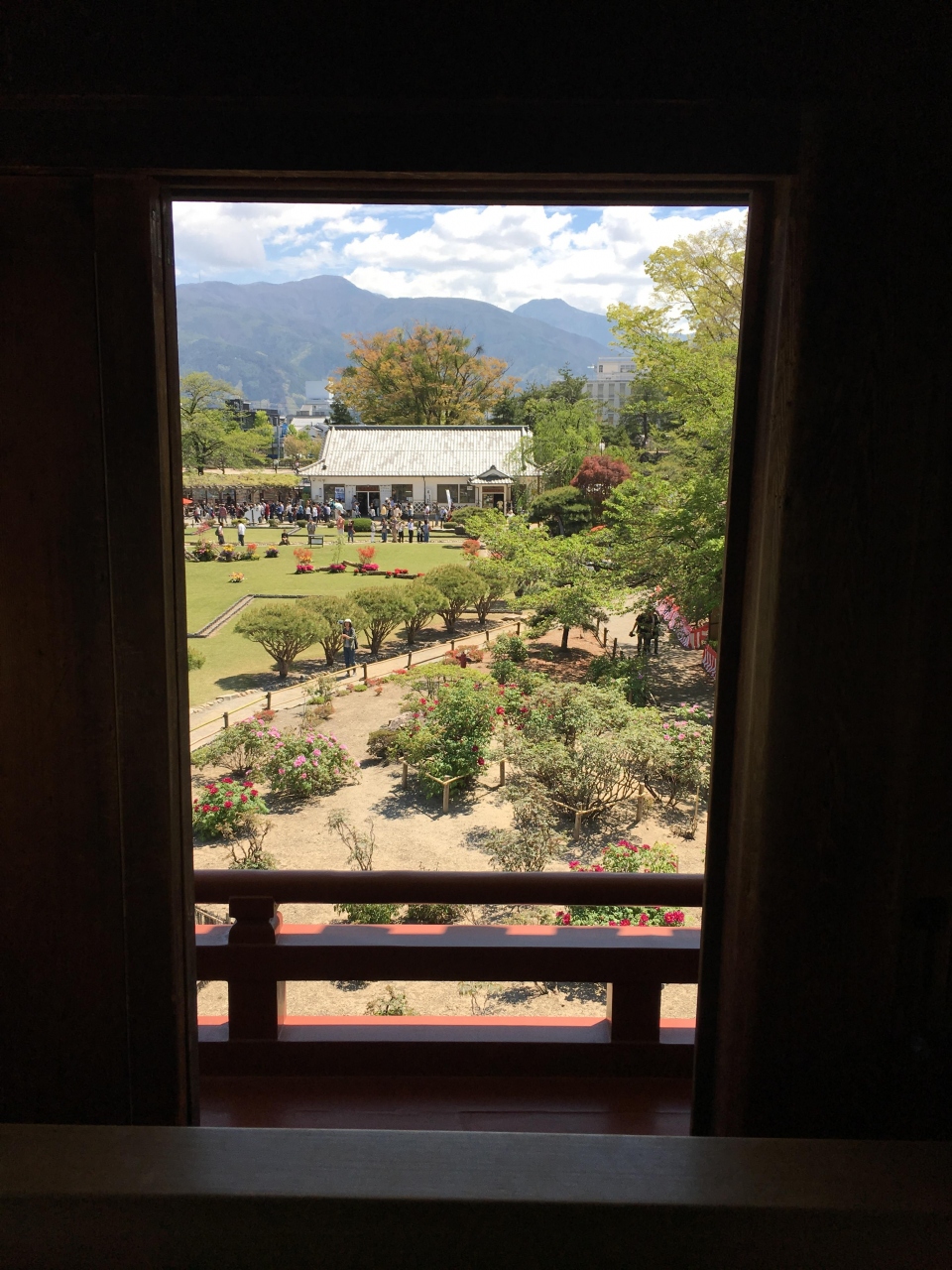 松本城内の見学ルートで一番最後に訪れる場所です。戦いが続いた時代が終わった後に増設されたということで、月を気持ちよく眺められるように、扉も開放的で、そこから眺める本丸跡の景色はとても良いです。外周には赤く塗られた回廊があり、それもとても印象的でした。