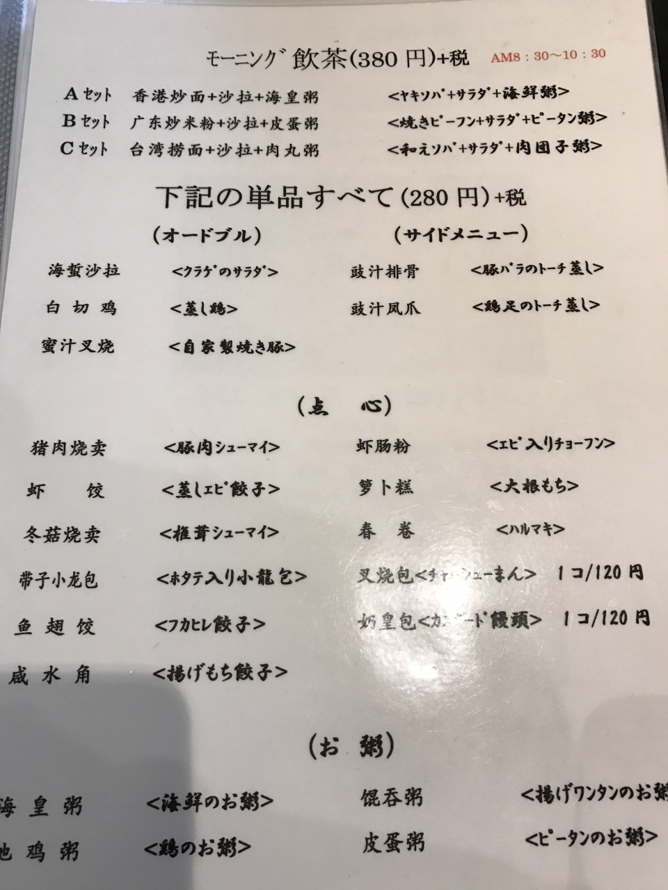 土日の8:30から10:30までしか営業していませんが、380円でお粥と麺がついています。お粥が美味しいし、胃に優しい。モーニング飲茶は、3セットの種類があります。海鮮粥がオススメ。遠方からは、行きにくいかもですが、お近くの方には最高。