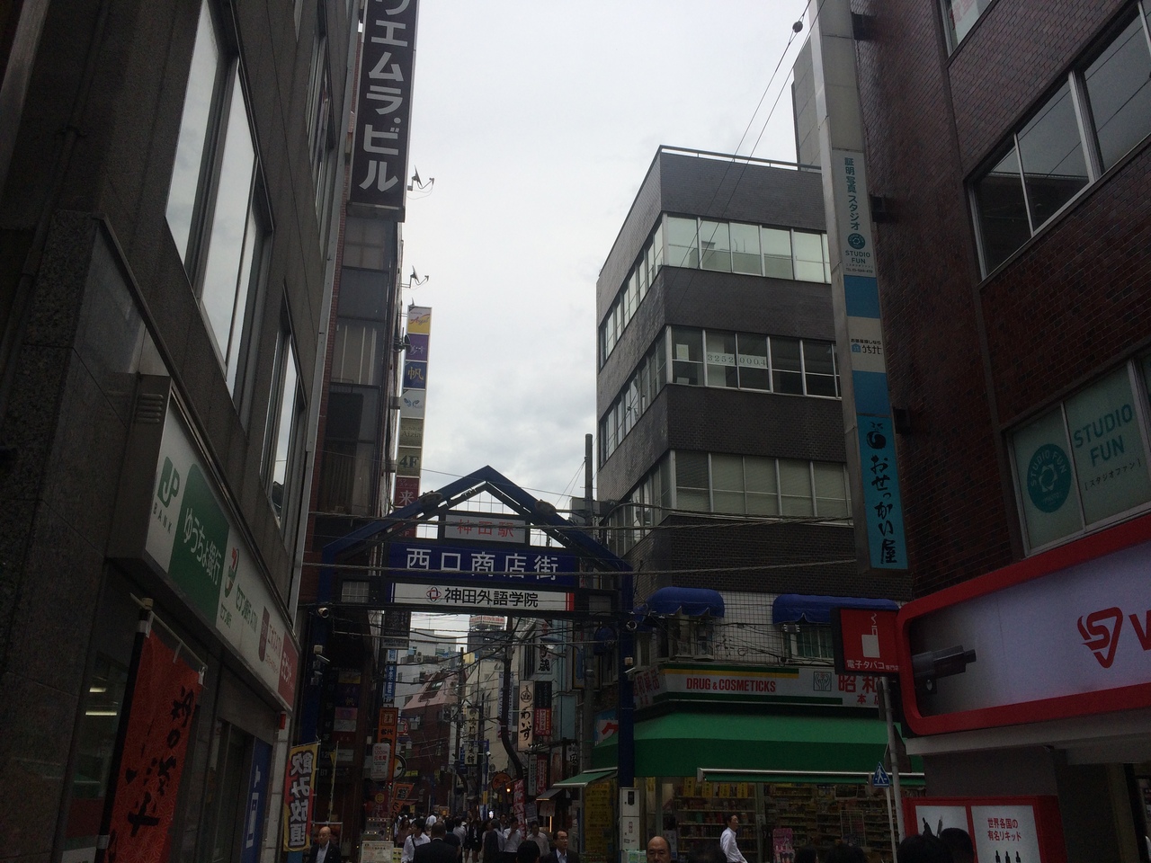 神田駅からすぐそばの商店街で、肉屋、野菜屋等の地元密着型ではなく、サラリーマンが多かったです。商店街は一直線に伸びびっしり店が立ち並んでいました。いつくか枝道もあります。高いビルはなく5階~6階ぐらいのビルが多いです。