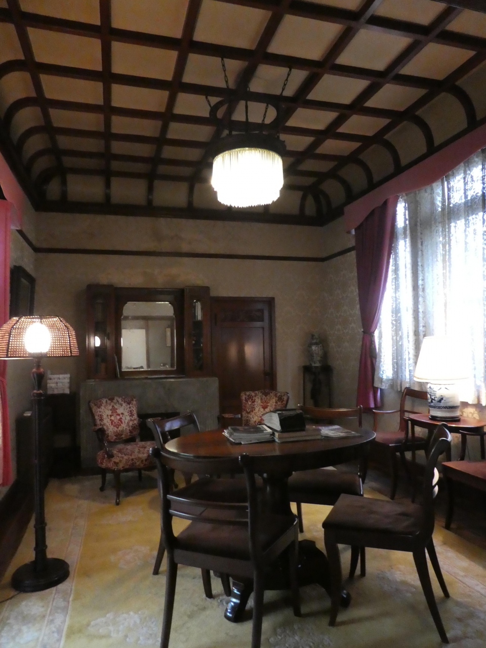 当時のままの窓ガラスをはじめ、欄間や照明、更に屏風などさりげなく置いてあるものも当然素晴らしく見応えがあり、また、展示されている大正~昭和初期の長襦袢等の図案が、とびきりモダンで素敵なのにも本当に感心した。