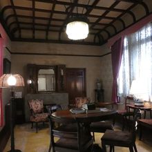 元は江戸時代に御殿医まで勤めたお医者さんの医院だった土地を、長襦袢や浴衣を専門に扱う大店の呉服店のご主人が買い取り、当時を代表する建築家2人(洋館部分が武田五一氏設計、和室は上坂浅次郎氏施工)が手がけた由緒ある住宅で、いかにも洛中の人、といった感じの、上品な(けど、田舎者(笑)的にはちょっと近寄りがたい?)現ご当主が、自ら由来を説明して下さる。