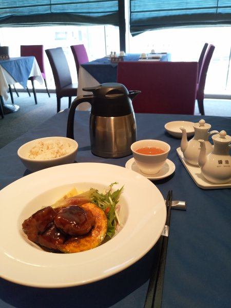 セットということでご飯がつきますが、五穀米に無料で変更して貰いました。そのほかには、スープ、香の物、本日の点心(しゅうまい2個)、目玉焼きのように見える杏仁豆腐でした。杏仁豆腐がひんやりと舌触りが良かったです。