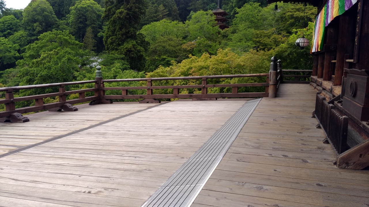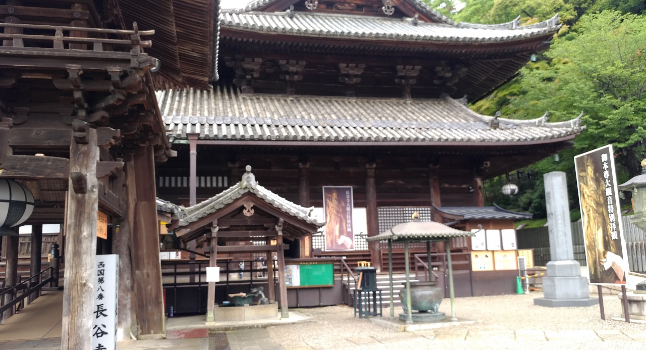 本堂へは得も言えぬ風情を醸し出している登廊を登って行く。この三百九十九の石段は、傾斜は緩やかなのだが、歩幅が合わず登りにくい。そのうえ、日頃の怠惰な生活による運動不足からくる体力の衰えを実感しつつ、喘ぎながら登っていく。登廊の終わった所が舞台造りの本堂である。観音さまにお会いする前に、一先ず舞台に出る。四方を囲む奈良の山々を眺め、初瀬の風を吸い込む。すると清涼感に満たされ、精気が甦る。さ~あ、観音さまに逢いに行くとしますか。