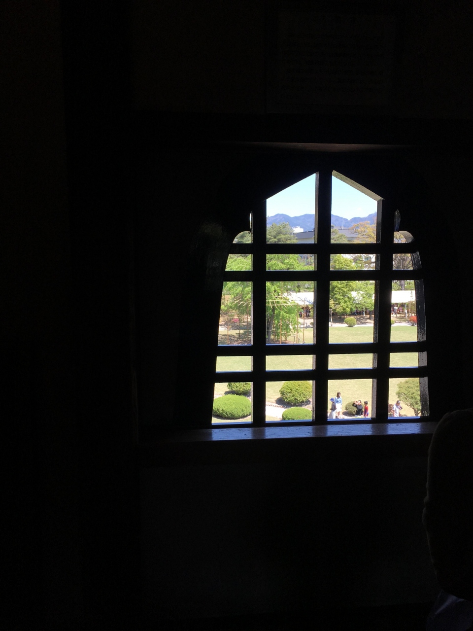月見櫓と大天守を繋ぐ場所にあります。現在はいくつか展示物が置かれていますが印象に残っているのは花頭窓。独特な形をしており大天守に比べると華やかな雰囲気がしました。窓を覗くと本丸跡を眺めることができ、後から増設された背景としては戦い用ではないのだなあと感じました。