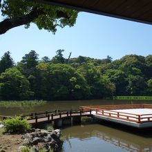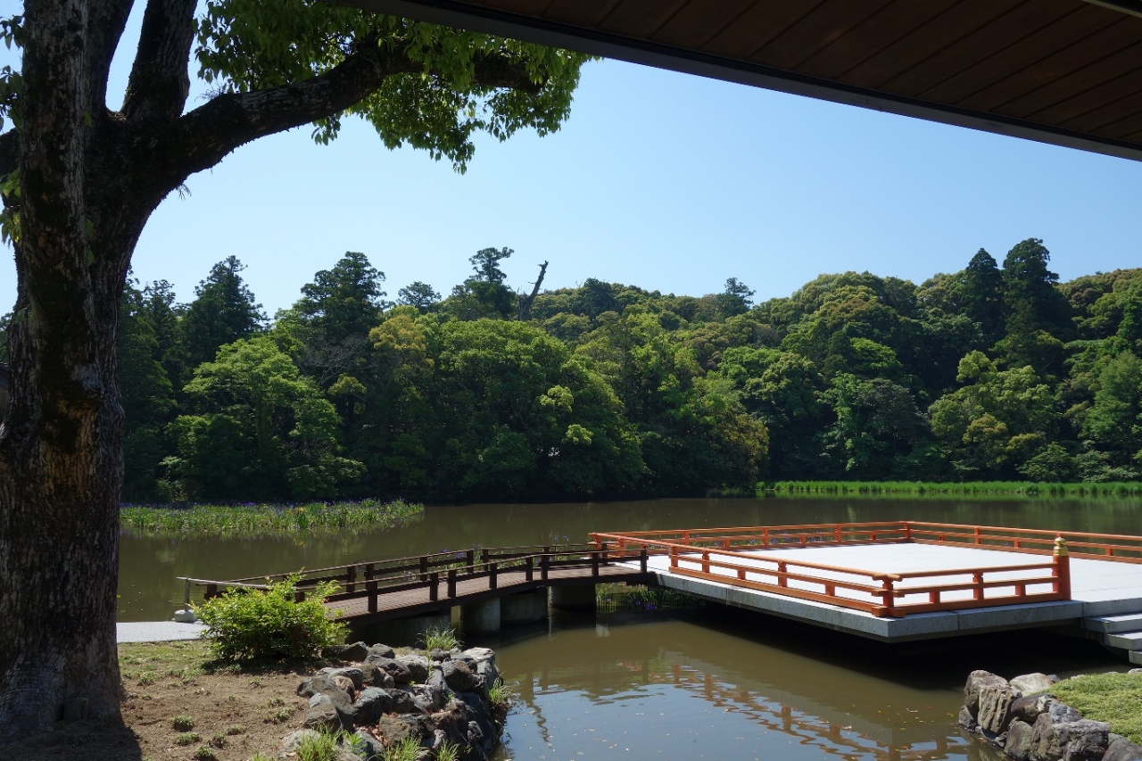 せんぐう館に隣接する大きな池で、菖蒲の花が咲いていたりお能の舞台が池の上に設えてあったりと、穏やかな気持ちになれる静かなお池です。せんぐう館からはガラス張りの窓から景色を楽しめる他、池の前には日よけとベンチも有って池を見ながらゆっくり休息も出来ます。