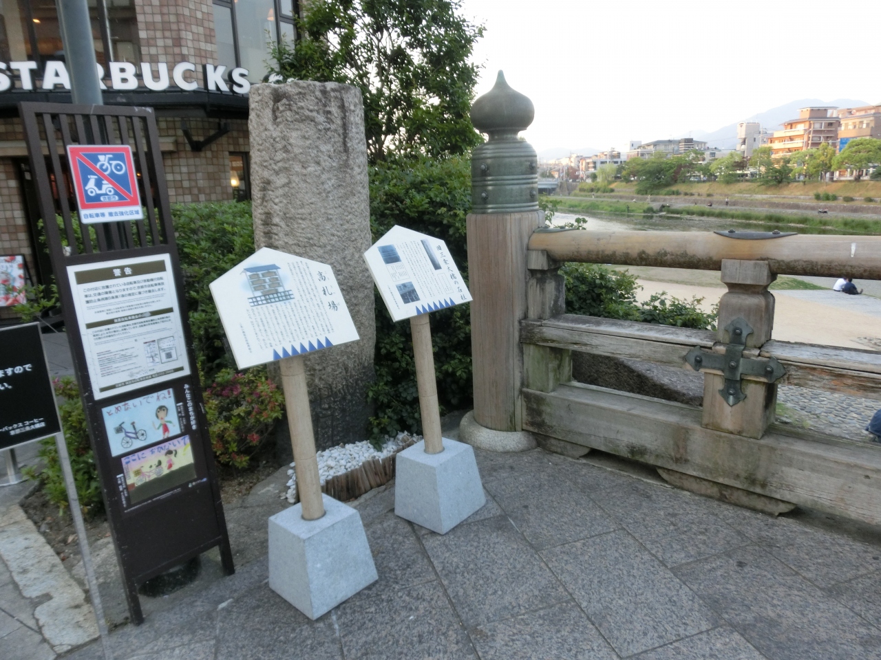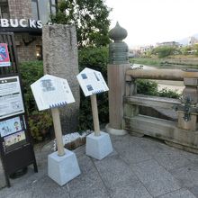 三条大橋の西詰めに石柱とその石柱についての説明板が立っています。
