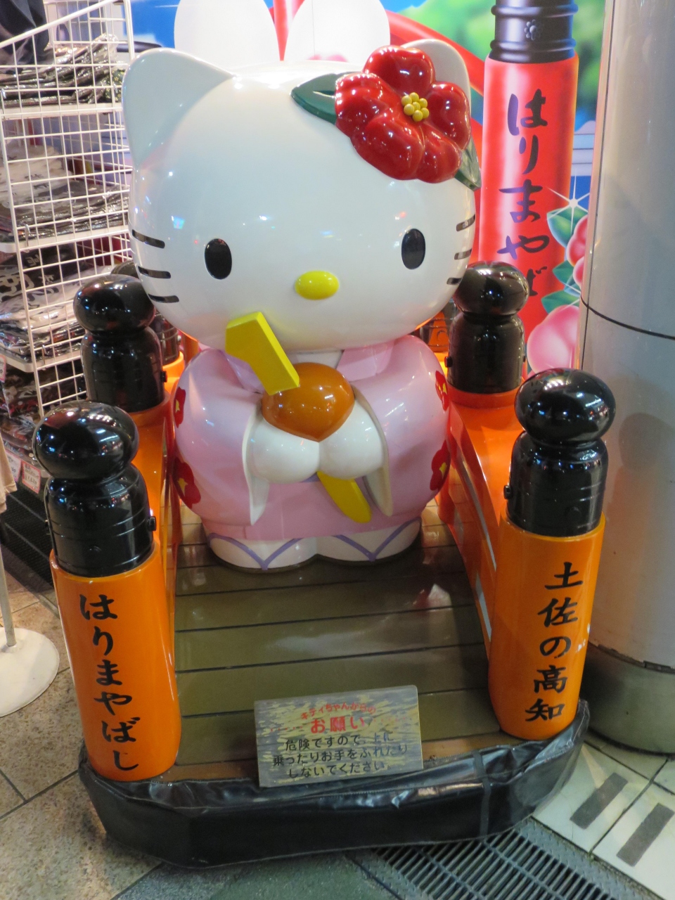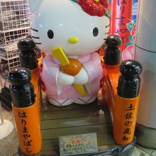 高知の京町商店街入口には高知土産のはりま家が3店舗ありますが、商店街入口左手にあるのが京町店です。ここでは高知特産の土産は勿論ですが、キャラクターグッズを沢山扱っています。見物は店頭に置かれた「はりまやばしキティ」。はりまや橋の上に着物を着てかんざしを持つキティは撮影スポットとして人気です。