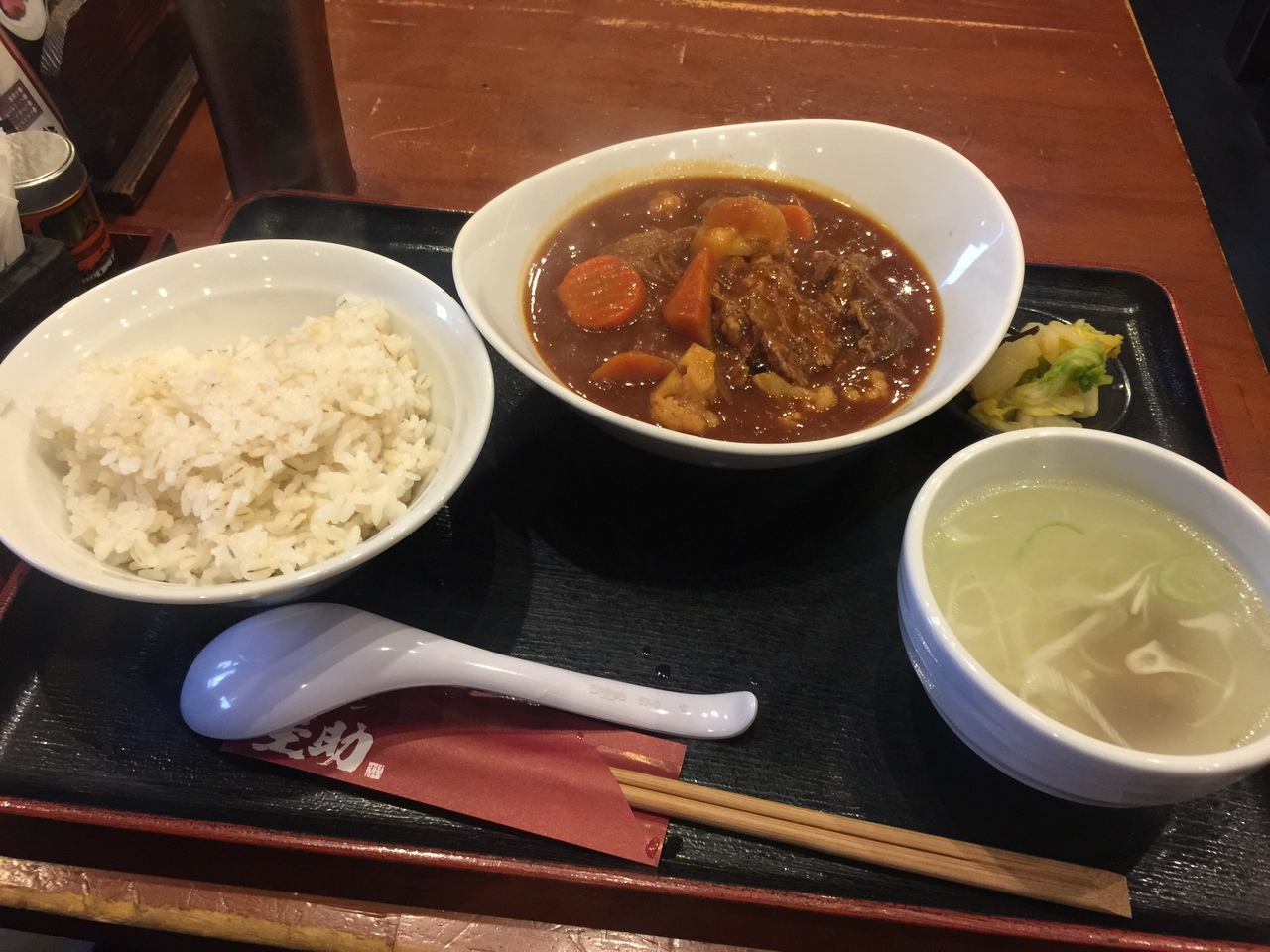 麦ご飯はお代わり自由、漬物と牛テールスープが付いてこの値段はイイですね(^ ^)