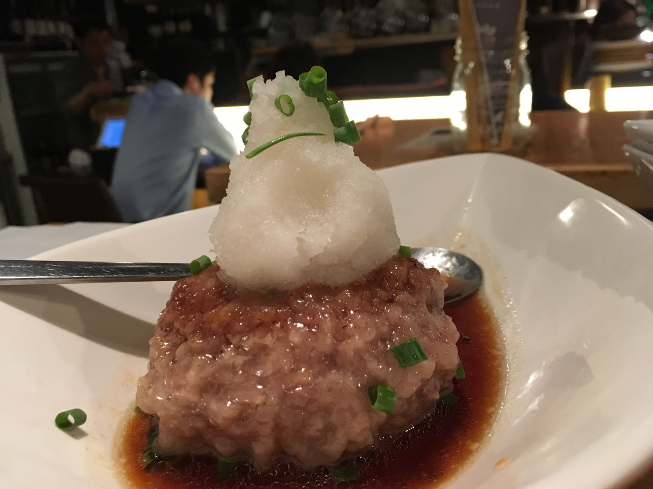 まず、飲み物。究極のグレープフルーツサワーとかそんな名称だったと思う。凍らせたグレープツフルーツがゴロゴロと氷がわりに(?)入っていた。ある程度時間が経つとグレープフルーツが溶けてくるので、それをすくい上げて齧ると、当然グレープフルーツで、しかもアルコールも浸みていてなかなかナイス。