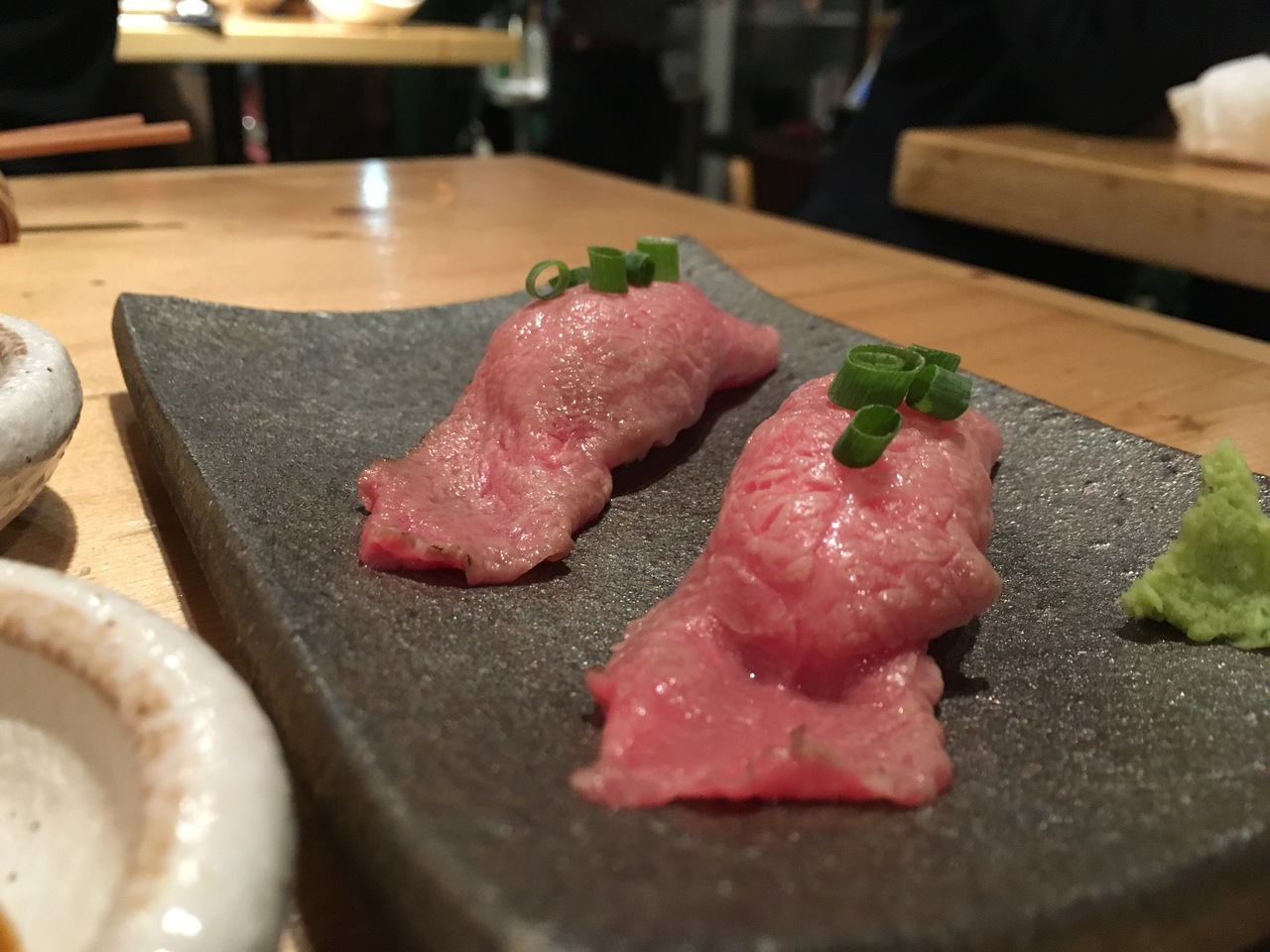 和牛のにぎり寿司が秀逸で、ほんのり温かいすし飯の上に極上の肉が乗っている。これにワサビと醤油を少しだけ付けて食べると、猛烈に美味い。一貫500円と高額でなければ10貫くらい食べたい。