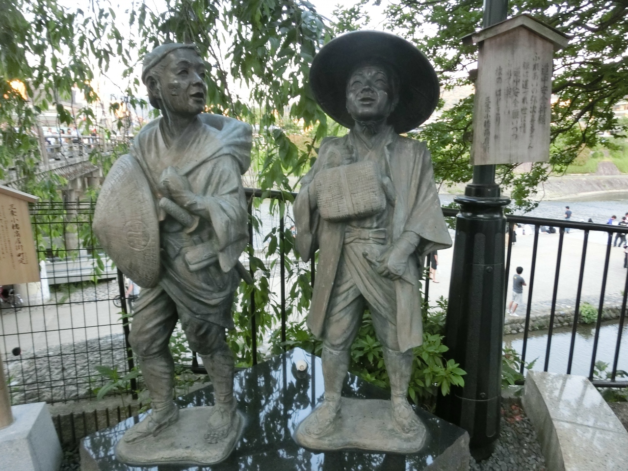三条大橋の西詰めのたもとに「東海道中膝栗毛」の弥次さんと喜多さんの銅像が立っていました。