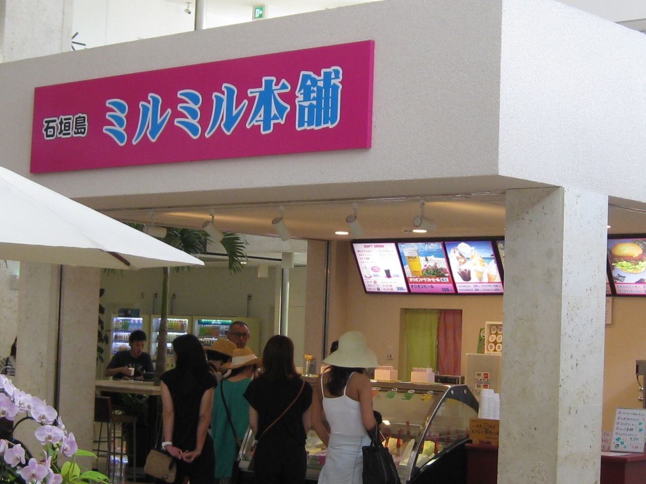 新石垣空港1Fフードコート内にあるカフェ、ピンクの店看板が目立ちます。石垣牛のハンバーガーを食べました、肉が溢れんばかりに挟まってボリュームたっぷりで、野菜が欲しくなります。ここは濃厚ジェラートが有名で美味しいそうです。