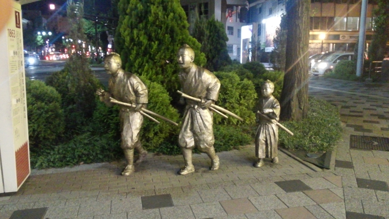 伝統的な日本の服を着て、長い刀を持つの3つの銅像(一名は子供)で、150年前に戦争についての歴史を記念されます。近くのボードでのその歴史に関する資料も紹介されます。日本語でだけでなく、英語の説明もあります。