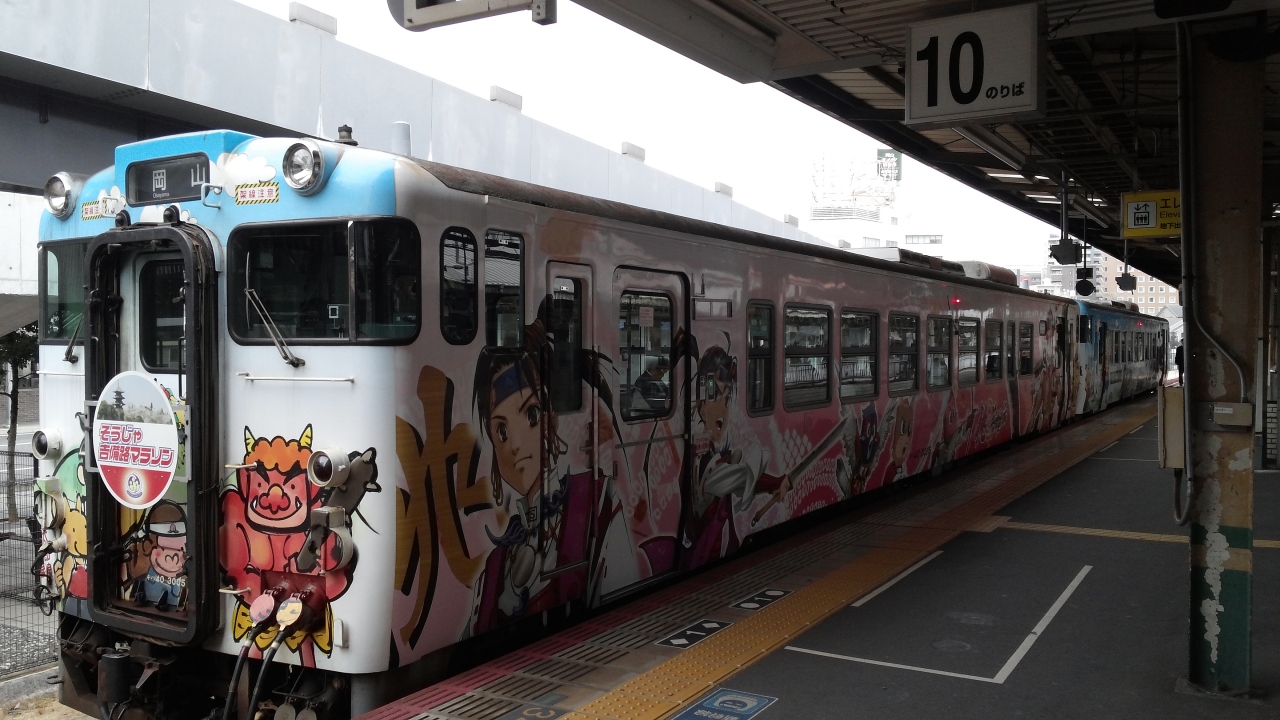 岡山、吉備津と備前一宮で桃太郎線を利用して、桃太郎の漫画に付けの列車は乗られました。乗る人が少ないです。帰る時にたくさんの学生利用しました。一時間に2本列車ごろだけありますから、時刻表を調べるのは大切です。