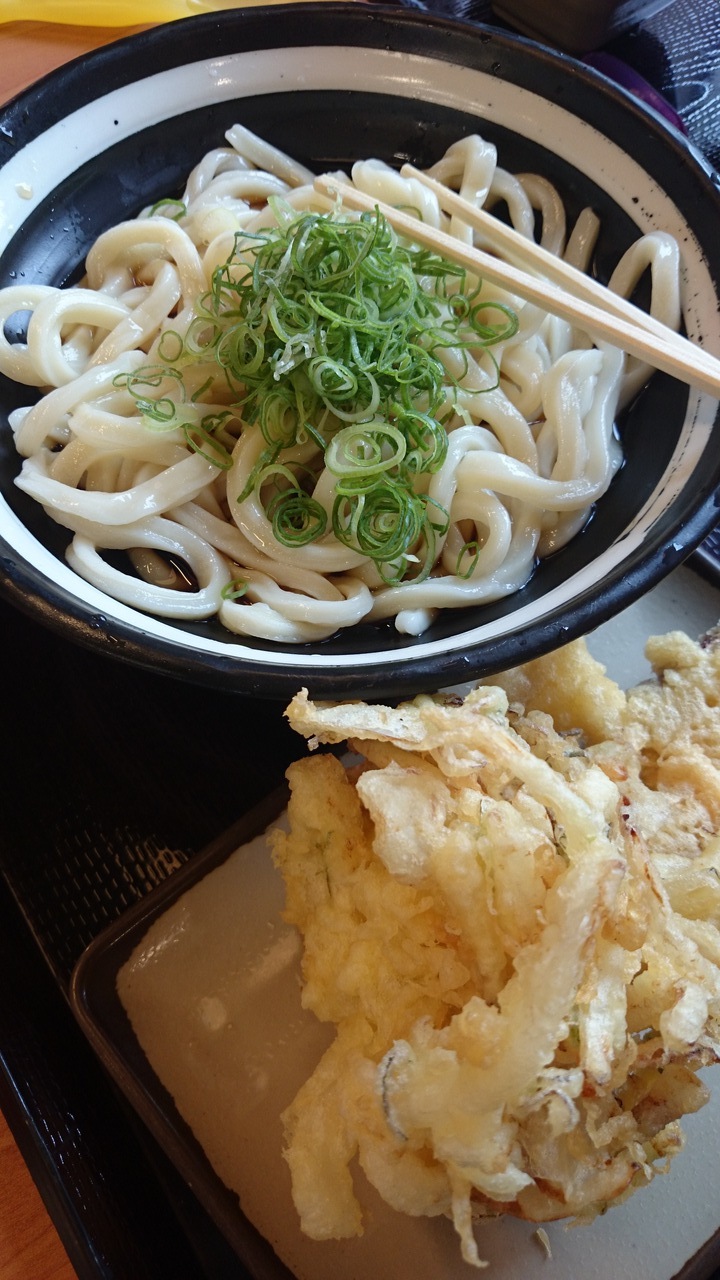 日曜日のランチで、嫁ちゃんと子ども二人とお邪魔しました。毎月25日はぶっかけうどんが半額なので、ぶっかけうどんの特大とかけうどんの大、かき揚げ天ぷらとさつまいもの天ぷら、子ども用に昆布おにぎりなどをオーダー。普段はあまり食べませんが、ぶっかけうどんもおいしいですね。
