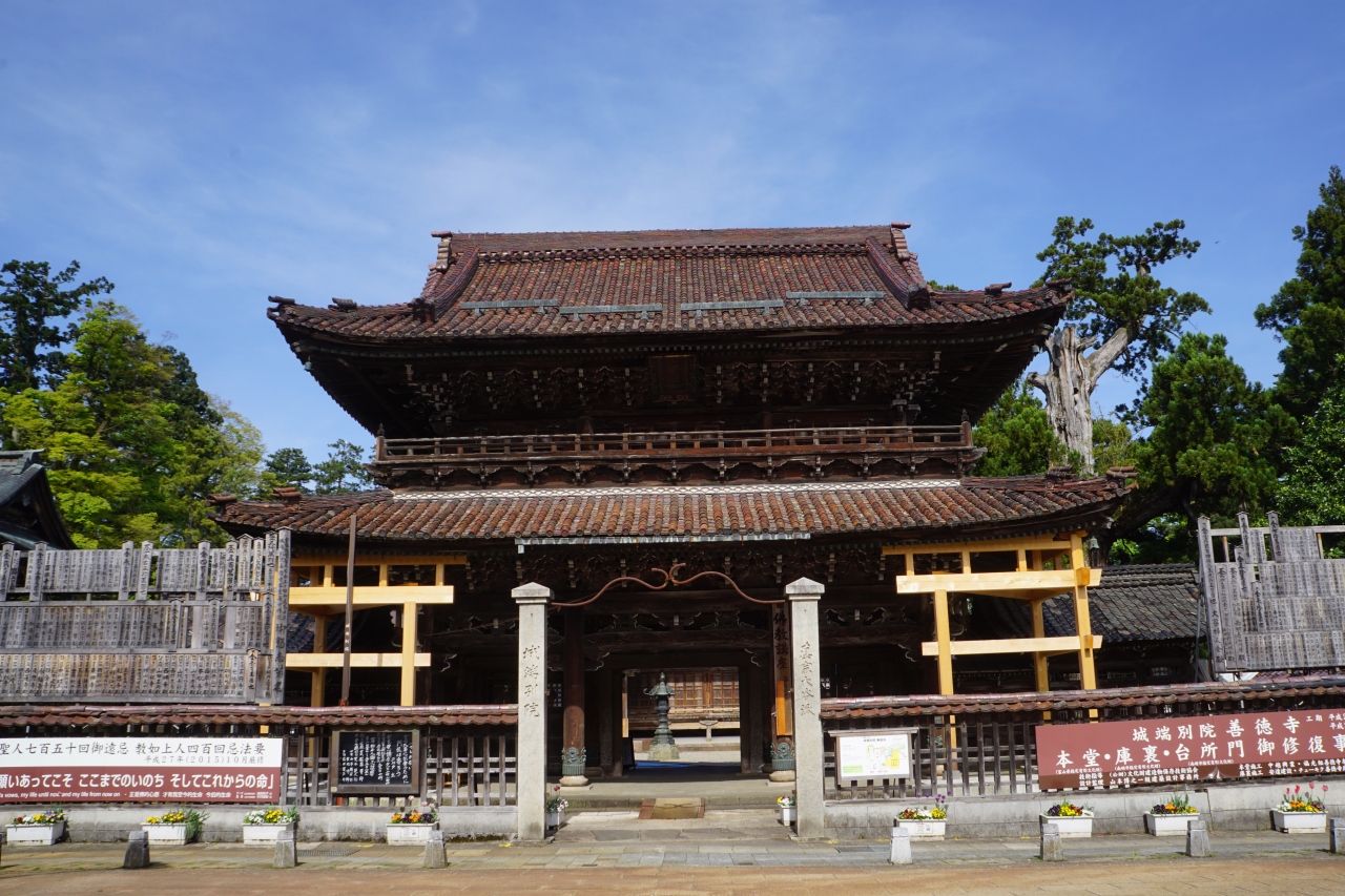 城端は小京都と呼ばれる雰囲気がある街ですが、その中心は善徳寺。街全体が善徳寺の門前町と言ってもいいかもしれません。街の中心部にでーんと構えた建物は、総赤瓦の山門はそれだけでも壮観。そして、その柱には装飾の銅板があてがわれて、またいっそうの威厳を感じさせる。目が慣れてくると本堂の大きさは思ったほどの規模ではないのですが、やっぱり山門の素晴らしさが抜きんでていると思います。