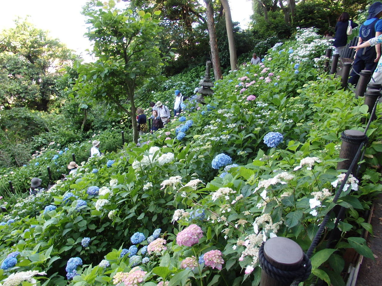 JR横須賀線北鎌倉駅より東慶寺(満開のイワタバコ、ナデシコ、シモツケ、アジサイは2~3分咲き)、浄智寺(鐘楼が山門と一体の構造)、葛原岡神社(アジサイ、カシワバアジサイ)、日野俊基の墓を経て源氏山公園に到着。源頼朝の像が立っている。桜の名所である。10分ほど進んで石段を登り源氏山山頂(93M)に到着。北側が開けている。このあと銭洗弁財天(宇賀福神社)、大仏切通し(鎌倉七切通の1つ)に寄って高徳院(鎌倉大仏)に到着。国宝阿弥陀如来座像と数年ぶりのご対面。仲間曰く数十年ぶりのご対面とか。10分ほどで、長谷寺に入る。アジサイ寺として有名。花には早いと思っていたが、今年は早く、見ごろであった。白、桃、青、濃青、紫等色鮮やかである。相変わらず人が多いのが難点。東慶寺では八重のドクダミを、葛原岡神社ではカシワバアジサイを始めて見ました。本日のコースは山歩きより、寺院と花散策が主で違った趣のハイキングでした