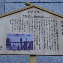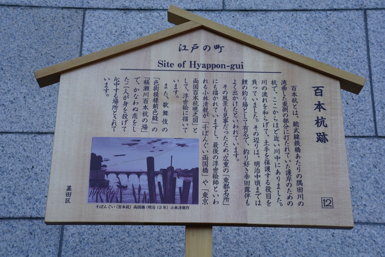 百本杭跡は、両国橋の歴史的な風景の一つとされるもの。護岸のために隅田川の東側に打たれていた数多くの杭が美しい風景となっていて、江戸歌舞伎でも、重要な場面ではたびたび登場するほどだったということです。