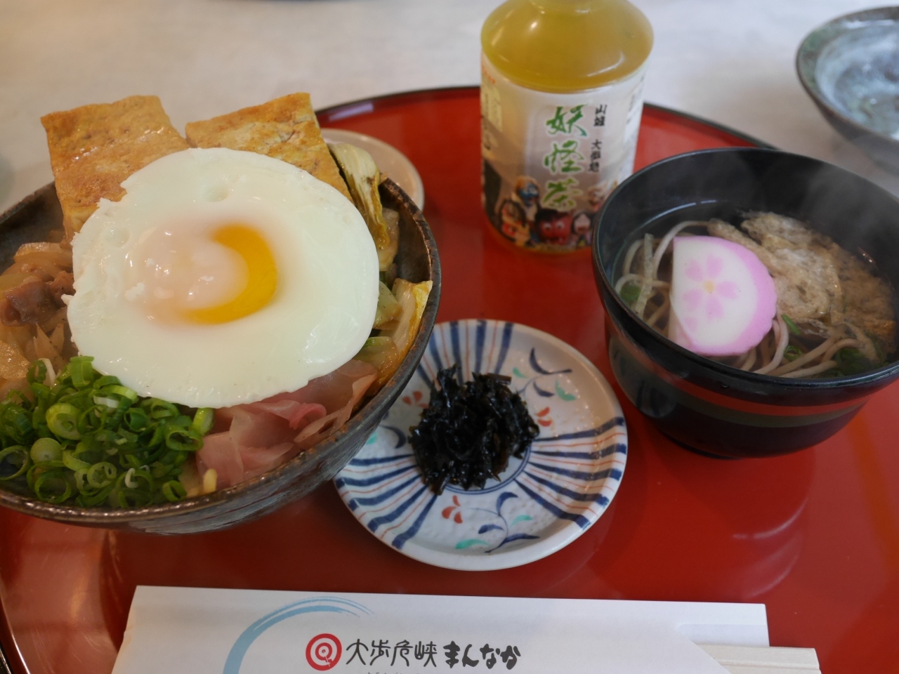 祖谷は妖怪で町おこしをしていて、こちらのレストランにも、一つ目丼(地のもののすき焼き丼)や、ひだるラーメン(「ひだる神」に取り憑かれると空腹で歩けなくなるのだとか)という妖怪モチーフのメニューがありました。