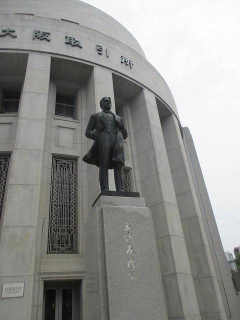 北浜駅を降りてすぐに大阪取引所があって、その正面にある像です。かなり大きな像です。大阪取引所をバックに立つ姿はとてもりりしくイケメンです。正直にこんなにイケメンの像はあまりないと思います。北浜のランドマークの風格があります。