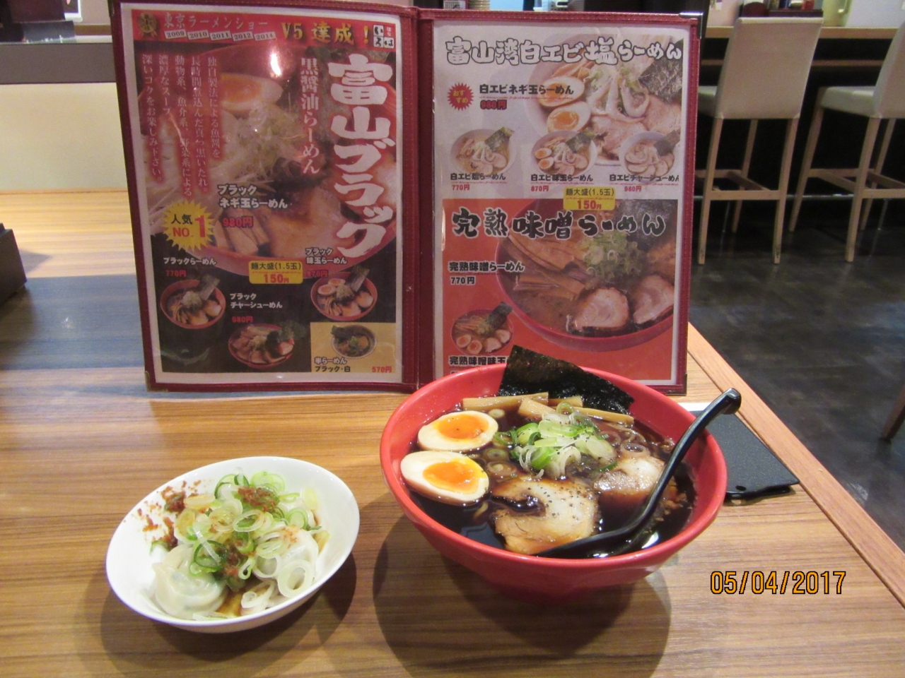 駅前ビルの地下にある綺麗な店でカウンター・丸テーブル・テーブルがあり広い店内で一人でも利用しやすかった。富山ブラック味玉ラーメン870円を注文。ちぢれ麺にメンマ・ネギ・チャーシューが入って味もさほど濃くて辛いということはなく、美味しくいただいた。スタッフも元気で明るい接客、店内にはジャズが流れなかなか良い店であった。
