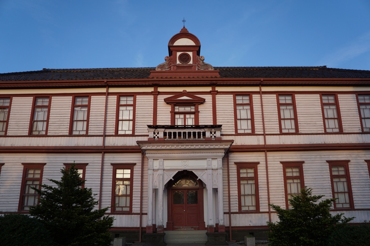 福野高校正門前に独立した敷地に建つ巌浄閣は、旧富山県立農学校の本館です。