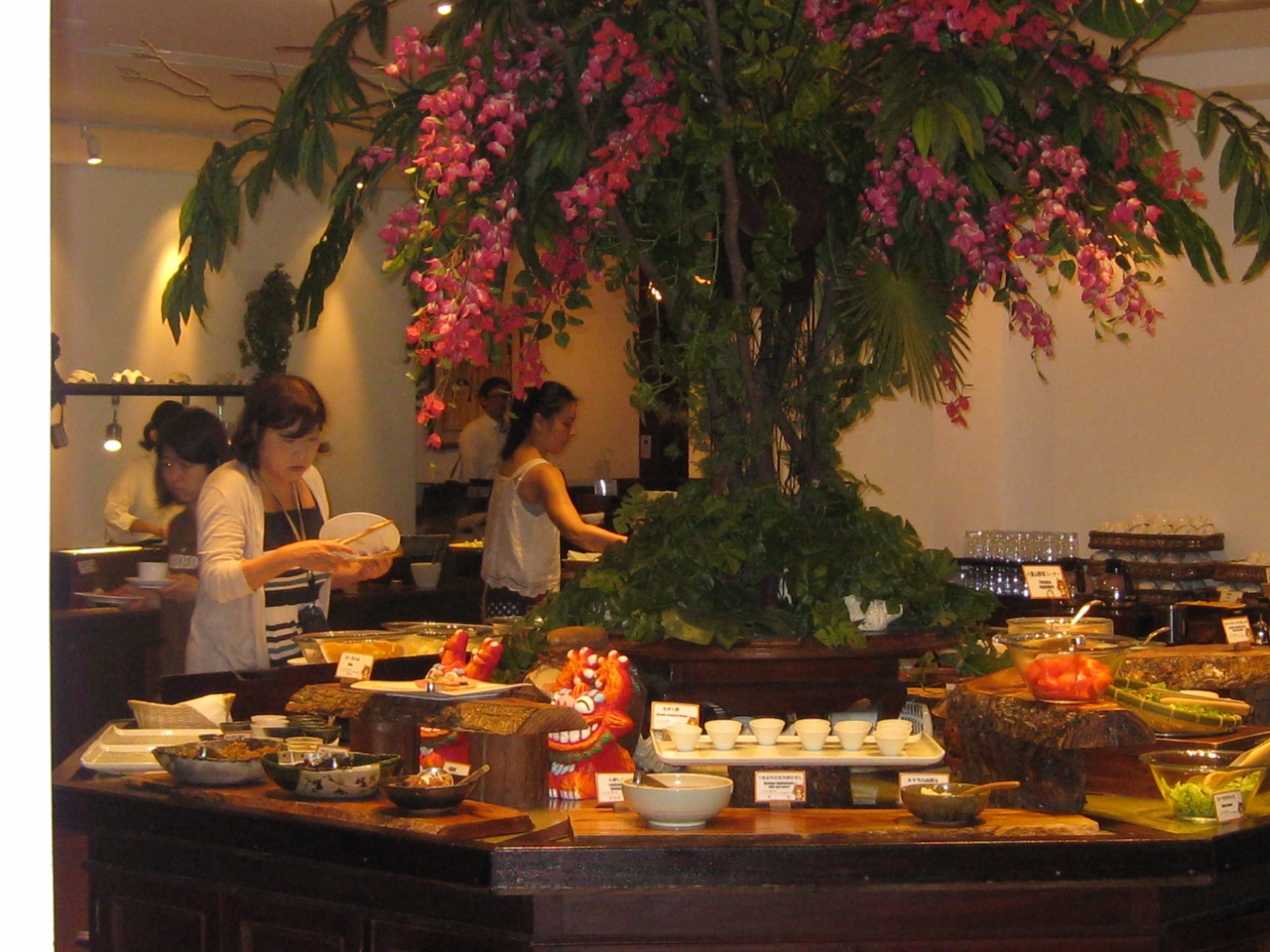 ホテルニラカナイの朝食会場、ビュッフェスタイルで店内は広く落着いた雰囲気でゆっくりとできます。メニューも豊富、パン、フレンチトースト、ハム、ソーセージと一般的な物から南の島特有の食材を使用したメニューと食べごたえあります。夜は完全予約制でビュッフェやスキヤキ・しゃぶしゃぶコースがあります。