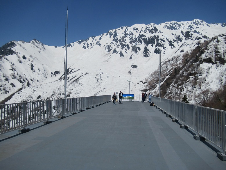 関電トロリーバスに約15分乗車し最初の見どころの「黒部ダム」で絶景を堪能し二つ目の乗物の黒部ケーブルカーでここ「黒部平」に到着です。この高さまで来ると一面残雪となっていてアルペンルートの素晴らしさがここでも観ることができます。