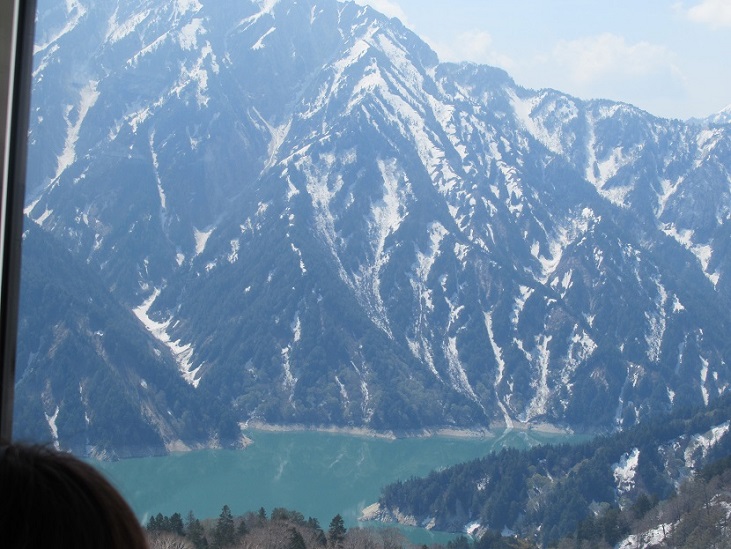 車内は満員ですが窓側に行ってくださいね、黒部湖とその周囲の山々の素晴らしい景色を見ることできます。