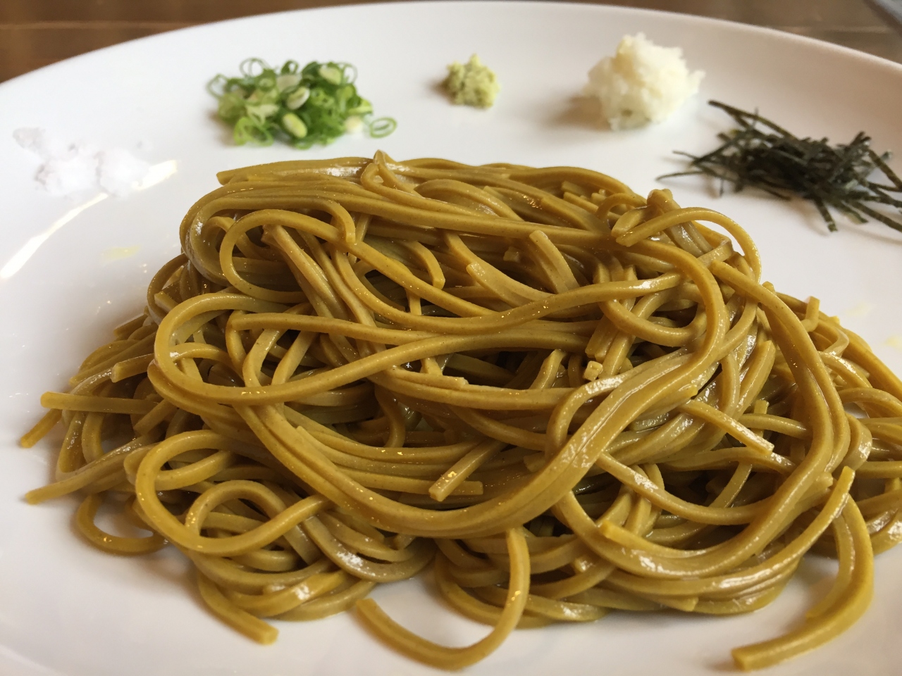といっても、こちらのお蕎麦は韃靼そばという珍しいもので、蕎麦自体の色がまるでウコンを練りこんであるような色。香りも、普段食べばれているものとは印象がずいぶん違います。
