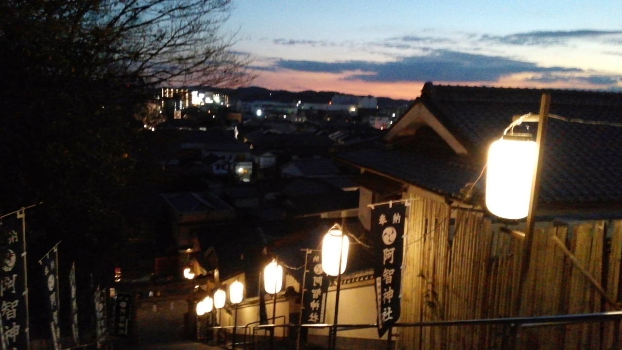 街からちょっと急な階段に沿って歩くのには少し大変です。賑やかな通りから強いコントラストを与えます。人気があまり高くないですが、下の建物の景色に、夕日の間特に素晴らしいです。神社の周りには多くの旗が風に揺れています。
