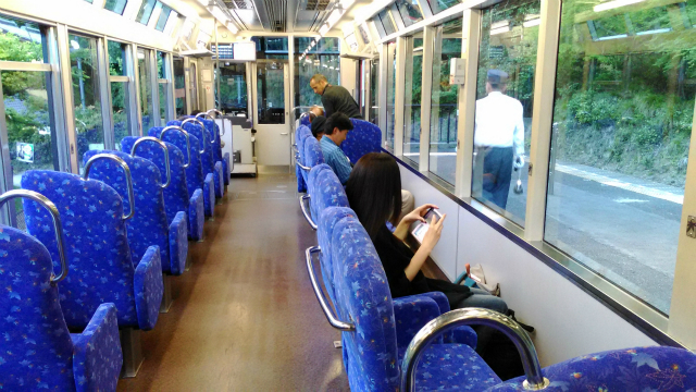 京都の出町柳駅から鞍馬方面と比叡山方面の二路線が走っているんですが、鞍馬方面には「きらら号」ってのがあって、二両編成の各車両に八席づつ窓を向いた座席があって、そとの景色を正面で見ながら乗車できます。
