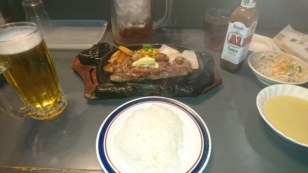 一人で気軽にステーキを食べれるところを探したら、ホテルの近くにあったので行って来ました。食券を買うシステムが庶民的でいいです。ステーキ1100円(サーロインかリブロースか選べます200g)、ビール200円でお腹いっぱいになりました。