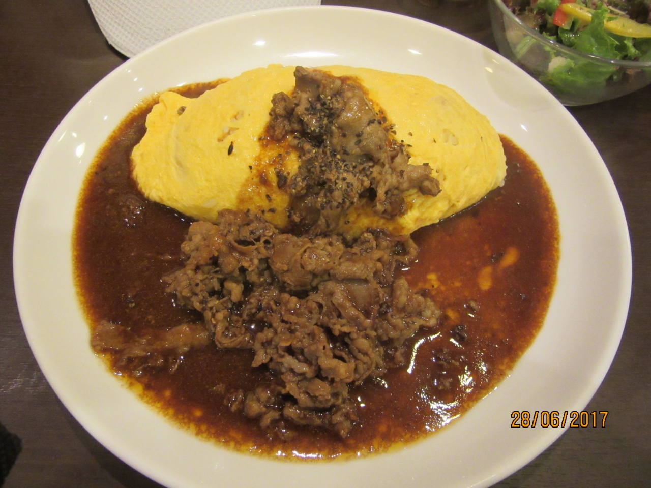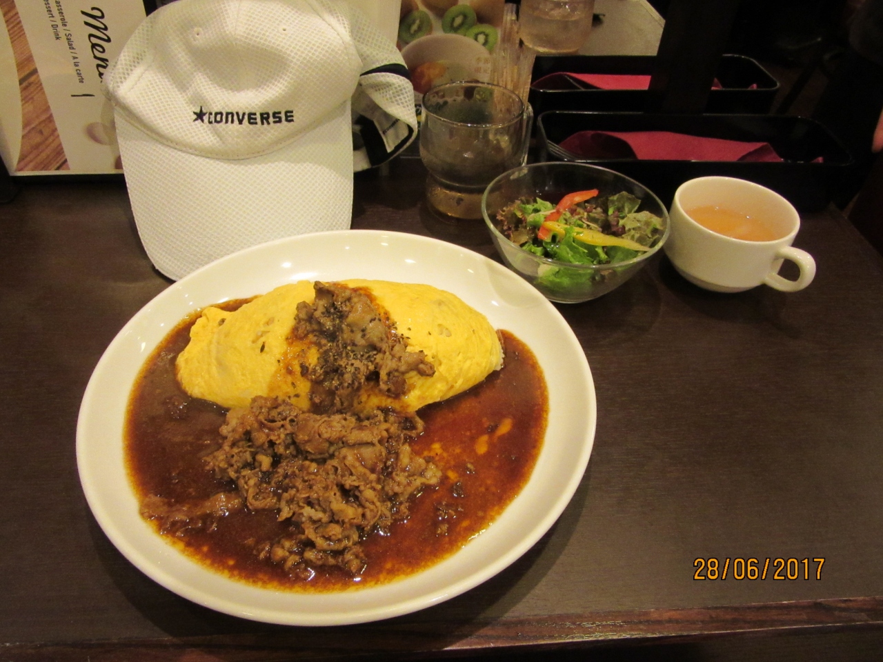 浜松町の貿易センタービルの地下で昼食をとろうとしたがちょうど12時でどの店もサラリーマン・ウーマンで行列ができていた。が、何故かこの店はすぐに入店出来そうだったので選んだ。表の張り紙に28日は一サイズ上のオムライスが同一料金(即ちLサイズを注文してもMサイズの料金)と書かれていたので、店のスタッフに再確認して、ビーフオムライスのLサイズを注文。サラダ・スープ付きでMサイズ料金の1,080円であった。1人用のカウンター席が6個、2人掛けテーブルの一人利用もできて、一人でも入りやすい雰囲気、しかもスタッフはとても良く気が付き水のサプライも頻繁に行うなどとても感じが良かった。肝心の味もオムライスのソースとビーフがとても美味しく良い店を選んだな、と思った。メニューに成分表示があり良心的。店を出るときには行列が出来ていた。