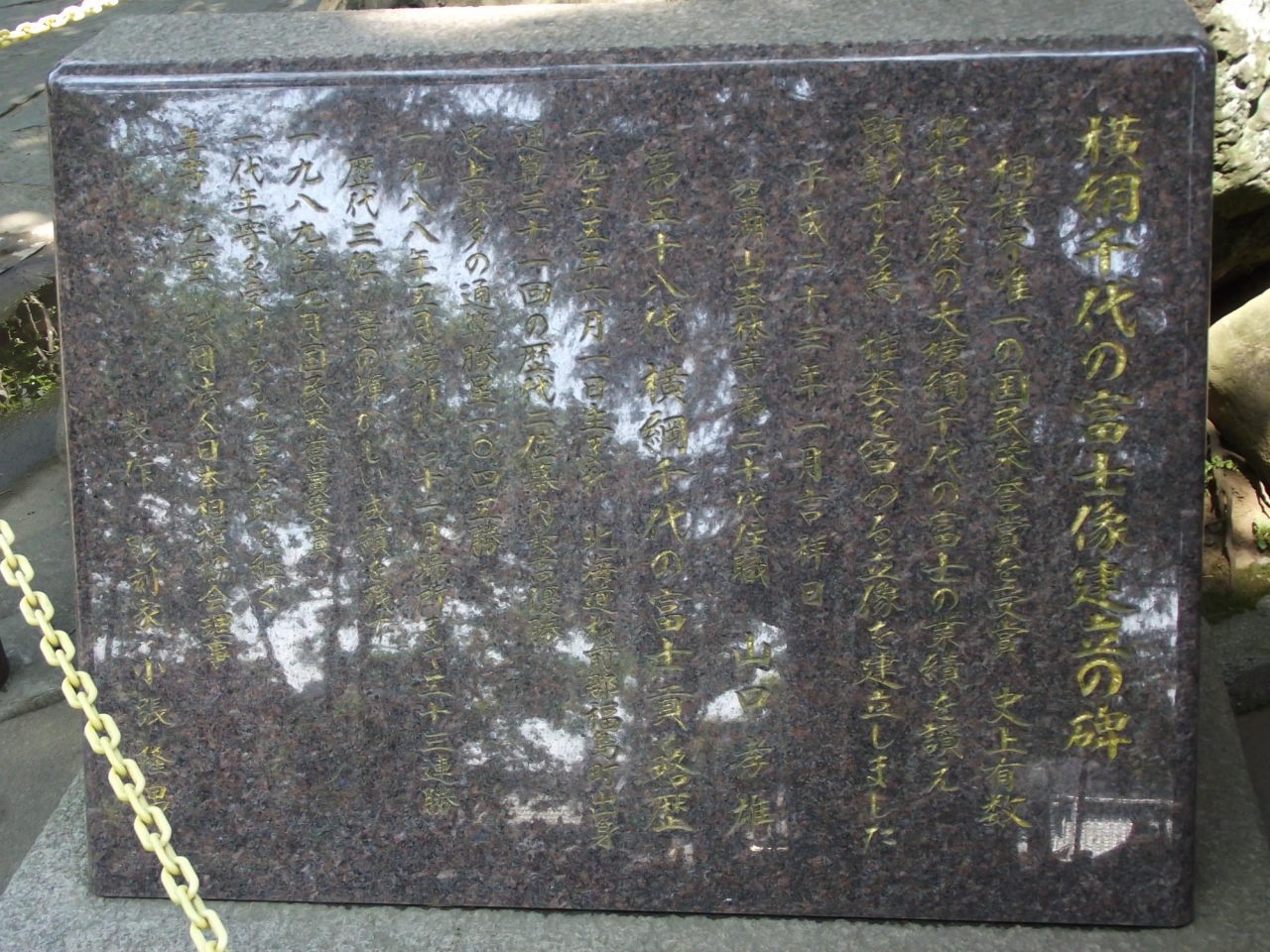 左横には顕彰碑ともいえる「横綱千代の富士像建立の碑」があり、相撲界唯一の国民栄誉首を受賞などの業績とともに略歴も刻まれています。