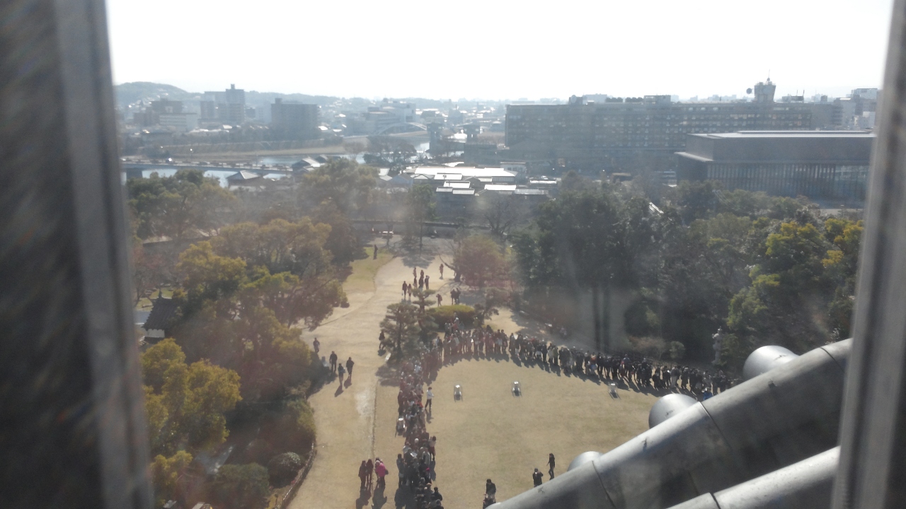 金色の鯱の像は近距離窓の外で観光できます。上の景色は普通ですが、大体目の前の橋、川、私立の建物などを見えます。冬の日でも、木は緑に成長します。ちょうど年の初日には無料で開放されます。その日に人気が高いです。