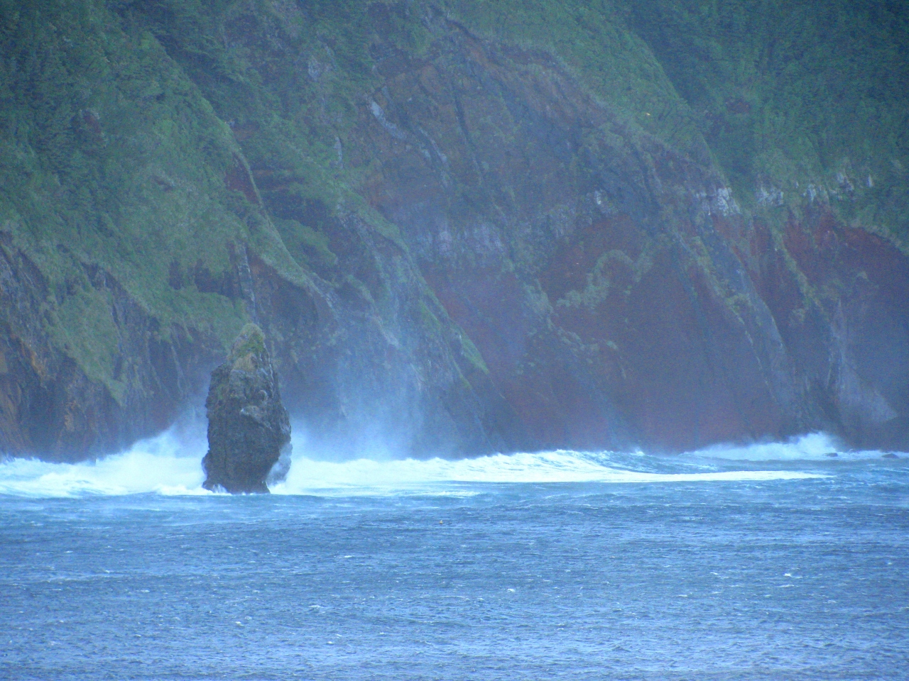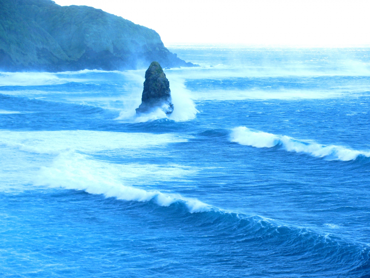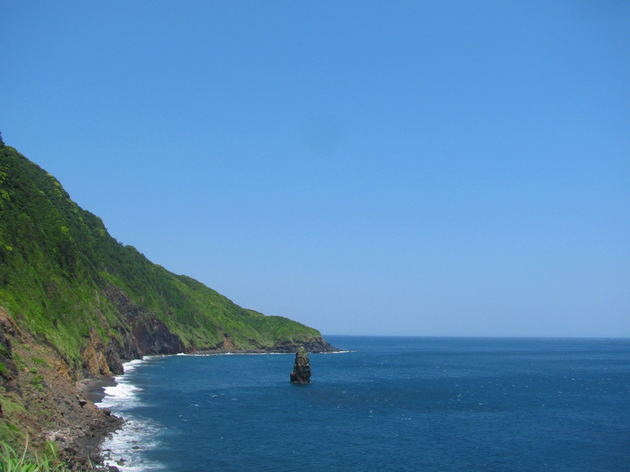 大島一周道路から見れる景観。筆島に行くには定期バスでは停留所から約15分。行くならレンタカーかバイク、自転車をお勧めします。また、波がある時はサーフィンを行っているシーンも見れるかもしれません。写真右側の海域では定置網が行われていることもあります。
