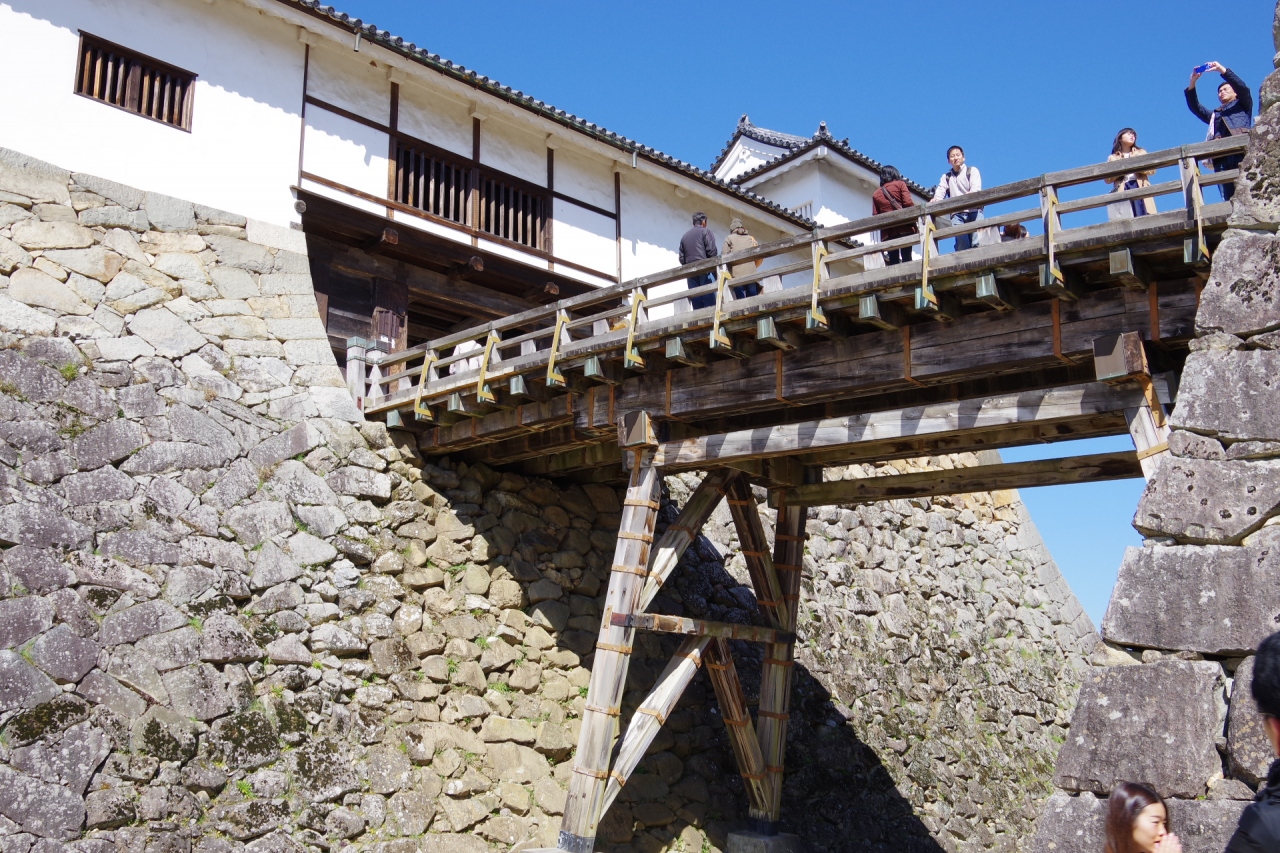 石段の階段を上った後に現れる天秤櫓は、上から見ると「コ」の字形をしており、大手門からと表門からの登城道をそれぞれ押さえるために両隅に2階建ての櫓を設け、中央に門が開く構造となっています。 江戸時代から、天秤櫓と呼ばれているそうです。