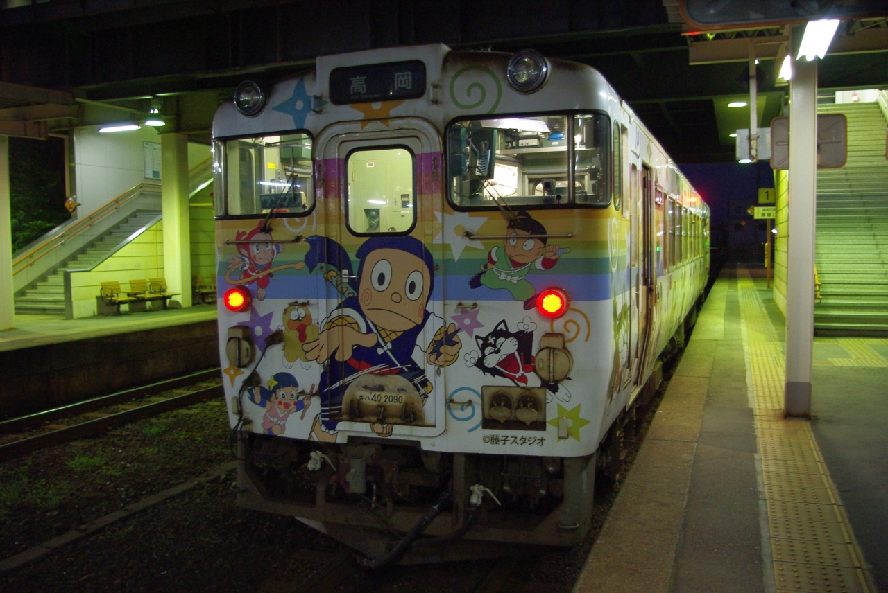 高岡駅を拠点に南は城端線、北は氷見線が出ており、両路線は車両運用が一体。氷見市出身の藤子不二雄A先生の名作「忍者服部君」が列車にペイントされている。