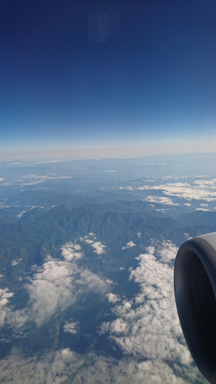 窓の奥に群馬の山地、諏訪湖を臨み、木曽駒ケ岳や御嶽山の傍を飛んでいく。