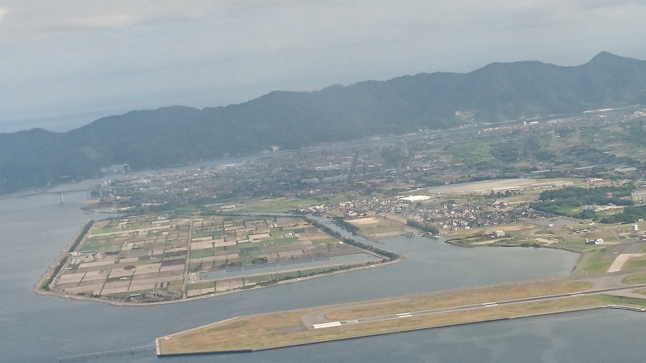 米子鬼太郎空港への着陸は、一度中海に出てUターンするように湖面に張り出した滑走路へと降りていく。