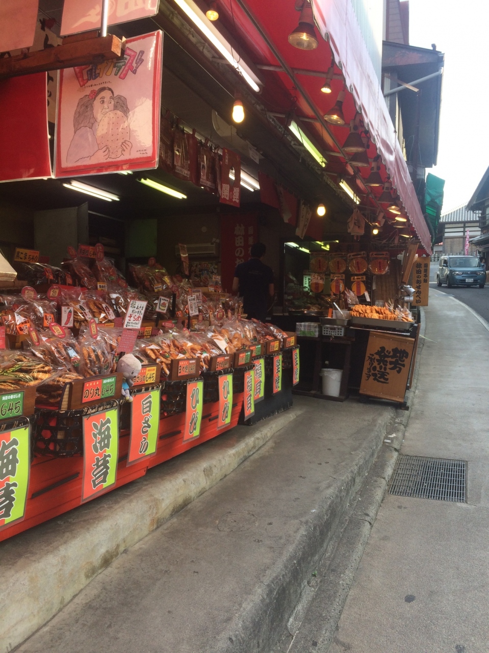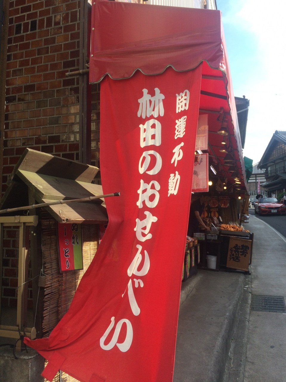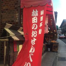 成田山新勝寺参道にある煎餅屋で、店の前にはたくさんの煎餅で埋め尽くされていました。串に煎餅を刺したものがあり人気メニューです。食べながら参道を歩けるのがよく、串は長いです。赤い看板が目印で他方発送も行なっています。