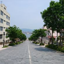 坂道の向こう側には函館湾に浮かぶ摩周丸が見えます。