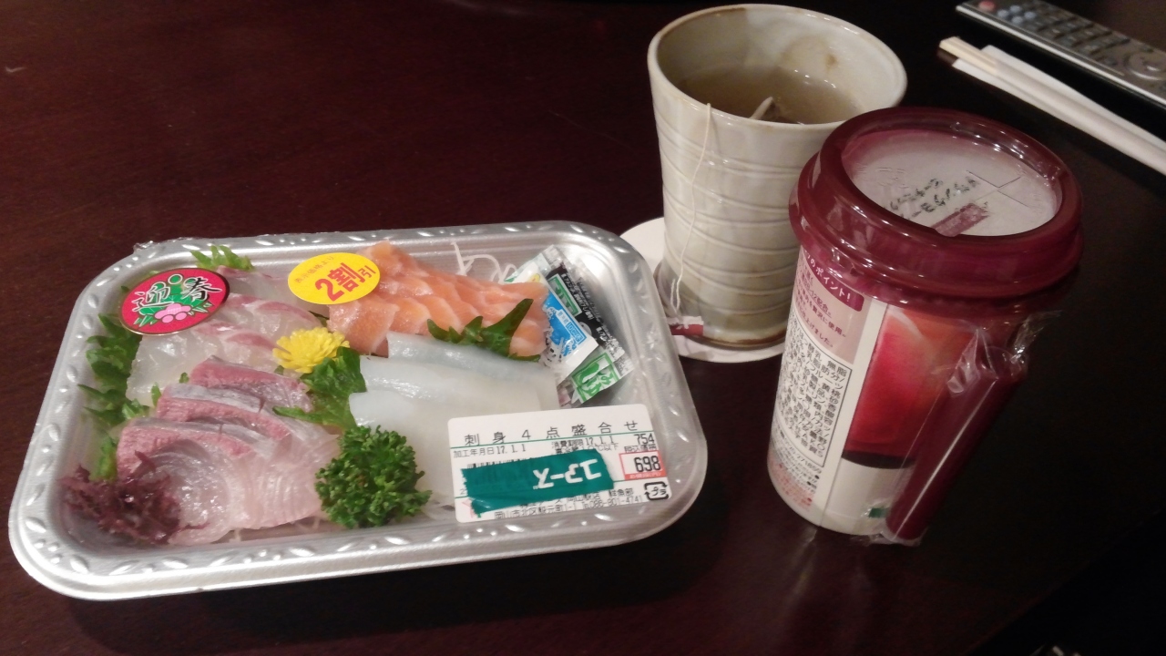 昼ご飯は少し食べすぎるですから、夜で岡山駅の傍のスーパーで簡単に新鮮な刺身が割り勘を買って、ホテルに持ち帰りました。とても便利です。また地元に岡山の白桃の飲み物をデザートにしました。駅の傍の店でいろいろなお土産も買えます。
