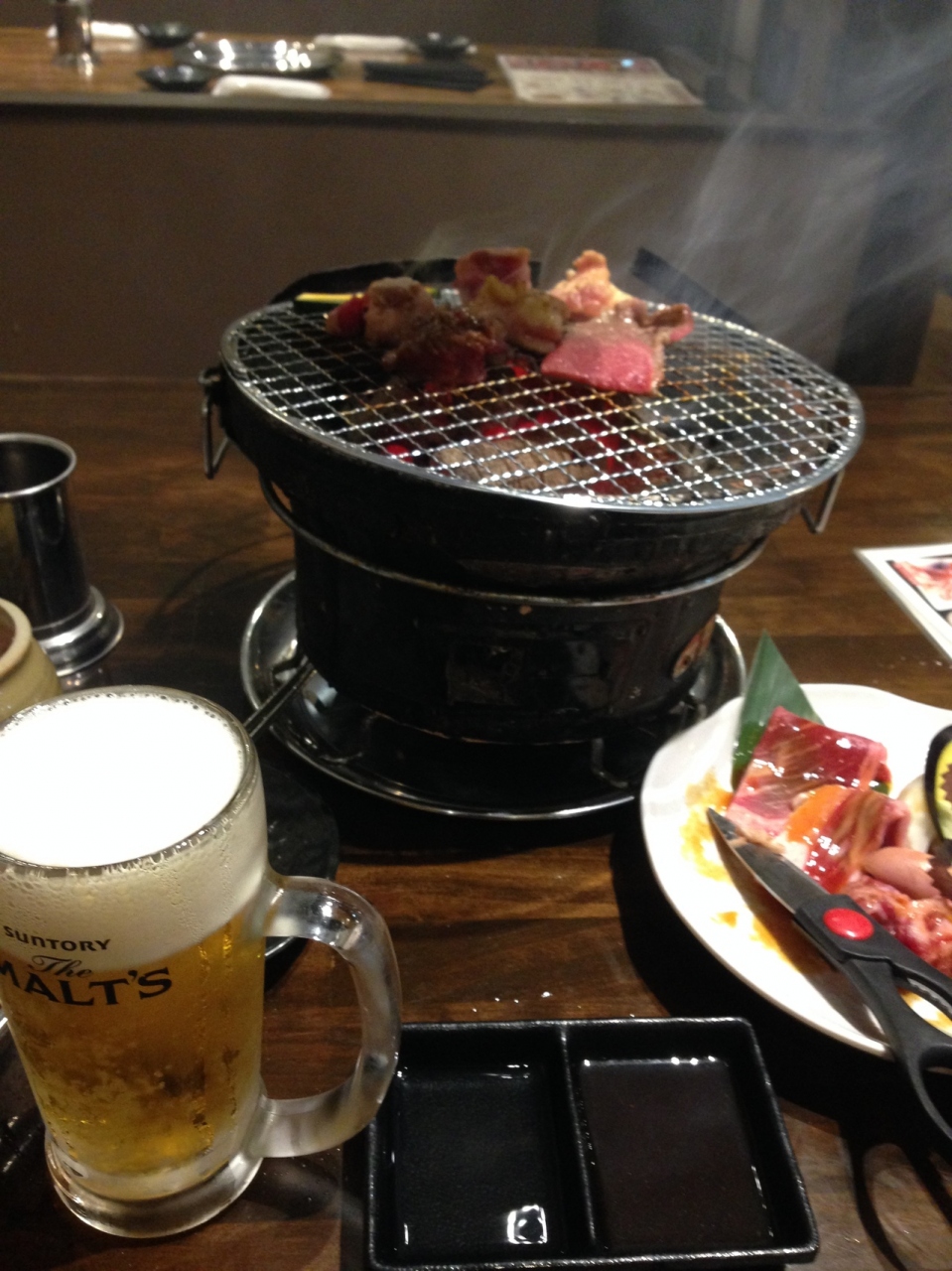心斎橋のアメリカ村のど真ん中にある一階が、ファミリーマート飲み二階にあります。来店したらにおい防止のために大きめのビニールをいただくことが出来ます。黒いエプロンもついていて、新鮮な対応です。炭火焼です。煙を上からすいとるので食べやすいです。食べ飲みが1人からいけるのでひとり焼肉にも最適