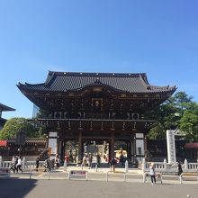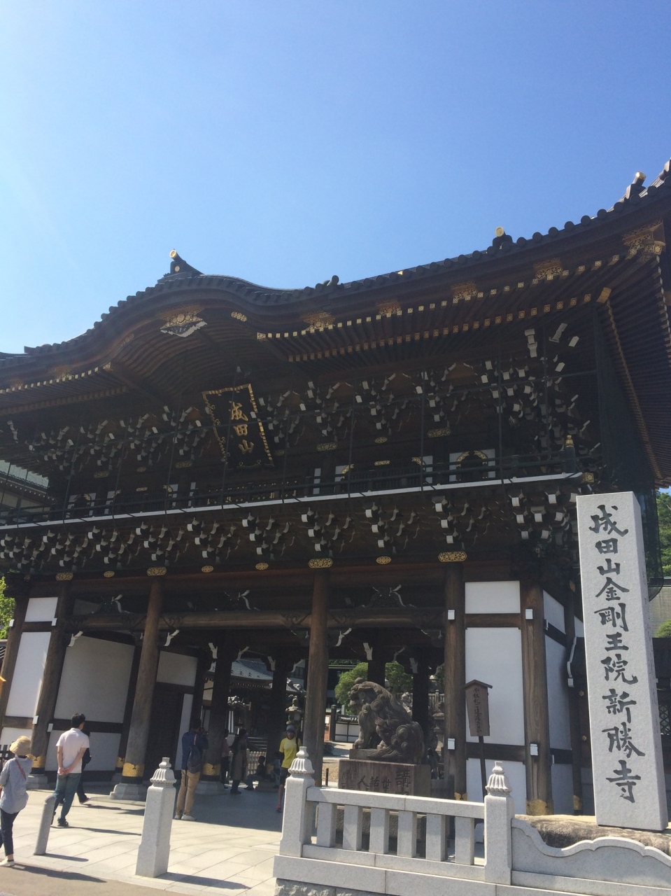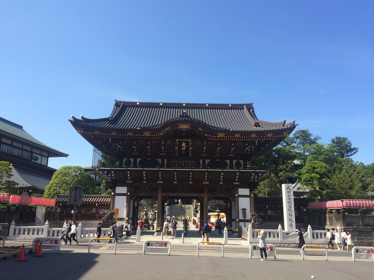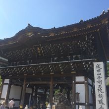 新勝寺の入口らしく大きな門で、本殿と同じぐらい迫力を感じました。門の上を見上げると十二支が祀られていましたが人が多く立ち止まっては見れませんでした。門の右側には新勝寺と書かれた石碑があり、門を潜っても石碑がありました。