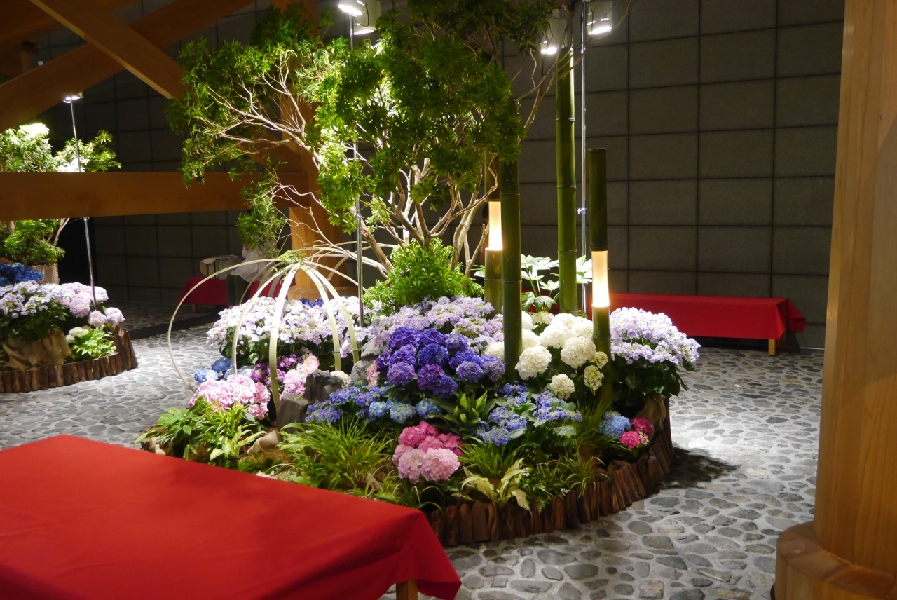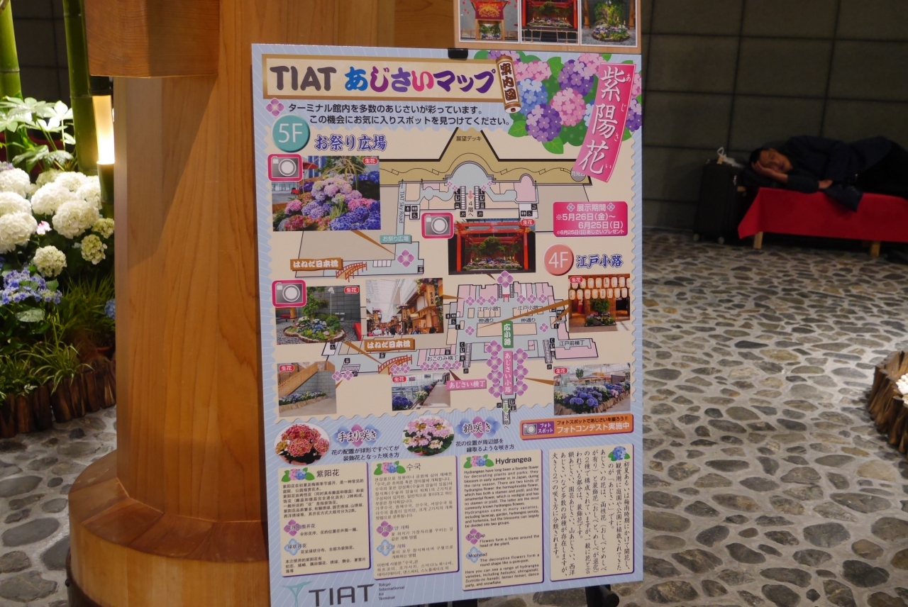 ターミナルの中は季節ごとに花が飾られ、梅雨時の季節はアジサイの花で埋め尽くされますが、何故か橋の上にはアジサイは置かれていませんでした。橋の下、3Fの橋げたのまわりにはベンチも置かれ、アジサイの花壇が造られ雰囲気を盛り上げていました。