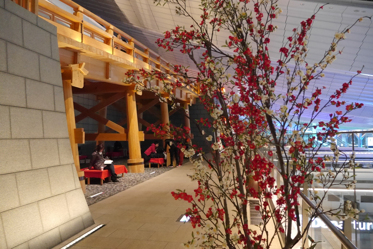 大勢の観光客がいますが、時々、人の写らない写真が撮れます。壁には江戸の錦絵が飾られ、反対側はチェックインカウンターを望めます。